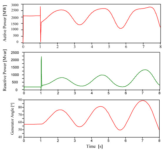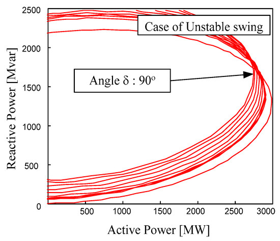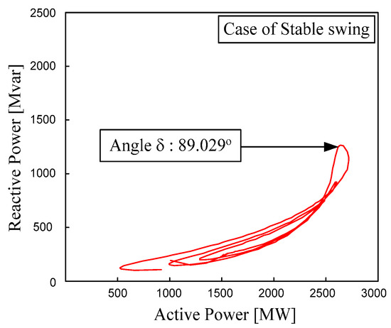 When the fault clearing time is one cycle, the trajectory of the complex power is as shown in Figure 9. After the occurrence of a three-phase fault, the generator angle increases to 89.029° and remains in a stable condition. Figure 10 shows that the variation of the generator angle and the reactive power after the fault. Herein, the variations between them are similar. Case 4.2 is the threshold situation for OOS in the KOREA system. It shows the stable power swing. If the system has taken action, such as tripping of transmission lines and switching of the buses, there is a possibility that it will return to the stable state. However, if the fault clearing time becomes longer, the out-of-step condition will occur. To prevent the out-of-step condition, the trajectory must remain a stable power swing.