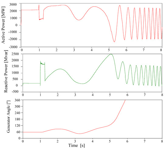 To assess the performance of the presented mathematical model in a fast power swing, another simulation was performed. Case 4.4 is the totally out-of-step condition. Figure 13 shows the trajectory of complex power. As mentioned in Section 3 above, in Figure 13, if the out-of-step condition is severe and fast, the trajectory of complex power has a shape of a complete ellipse. After the occurrence of a three-phase fault, the generator angle increases beyond 180°. Figure 14 shows the variation of the generator angle and reactive power after the fault occurs. Up to about 5 s, the trajectories are similar. However, at 7.5 s, the out-of-step condition of the generator occurs. The trajectory of the complex power is close to an ellipse, and the presented mathematical model of complex power strongly suggests a possibility of application in the detection of out-of-step conditions.