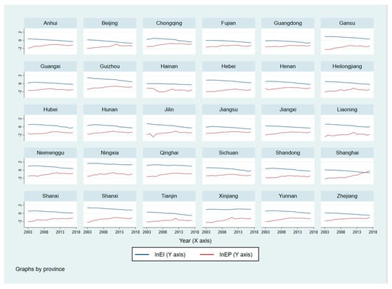 44], the current study used data from 30 provinces in China over the period 2003–2017 to examine the linear effect of energy price on energy efficiency; the model is express as below (as all the variables in Equation (1) except energy intensity and energy price are in the form of proportion or index, the current paper only performed the logarithmic transformation for energy intensity and energy price):