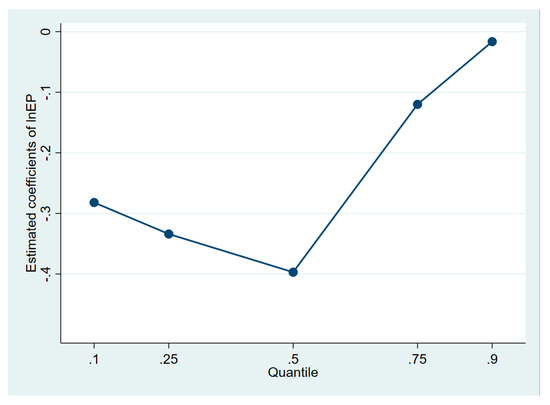 Figure 3 show that, similar to the results of the full sample, the coefficients of energy prices at the 0.1, 0.25, 0.5, 0.75, and 0.9 quantiles were all negative; in addition, we found that except for the 0.9 quantile high energy intensity (that is, low energy efficiency quantile), the coefficients were highly significant. Meanwhile, we further noticed that the absolute values of the coefficients of the energy price go in the same direction with the energy intensity, and it shows that there was an inverted U relationship. This indicates that between the areas with high efficiency and the one with lower efficiency, the influence of energy price on energy efficiency seemed to be most significant for an intermediate level of efficiency. On the one hand, this can be explained by the fact that there was a relatively more sound market mechanism for the areas with higher levels of energy efficiency, and the issues of resource misallocation derived from energy price distortion was relatively smaller, and the energy prices were more prominent in promoting energy efficiency in these areas. On the other hand, the industrial structure in areas with high energy efficiency was more optimized, economic development was less dependent on energy efficiency; therefore, the effect was relatively limited. This explains to a large extent why the effect of energy prices was most prominent in the middle level of energy efficiency. It is worth mentioning, in particular, compared to the areas with low energy efficiency (i.e., 75% and 90% quantiles of energy intensity), the effect was significantly greater in the areas with high levels of energy efficiency (i.e., 10% and 25% quantiles of energy intensity).