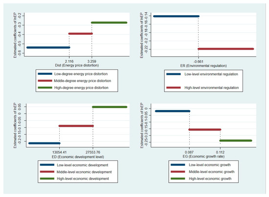 Figure 4) reports that when there are different value ranges for environmental regulation, the estimated coefficients of energy price lnEP were all significantly negative; this indicates that under different environmental regulations, energy prices always have a promoting impact on China’s energy efficiency. However, when the environmental regulation index was below the threshold of −0.661, the absolute value of the lnEP coefficient was 0.141. When it crossed the threshold of −0.661, the absolute value of the coefficient increased to 0.219. This indicated that in areas with higher environmental regulation intensity, the effect was more obvious. As discussed in the previous theoretical analysis, the areas with higher levels of environmental regulation have higher environmental governance costs and greater motivation for technological progress, and rising energy prices can further promote energy factor substitution and enterprise technological innovation which, in turn, will produce a more obvious positive effect on energy efficiency.