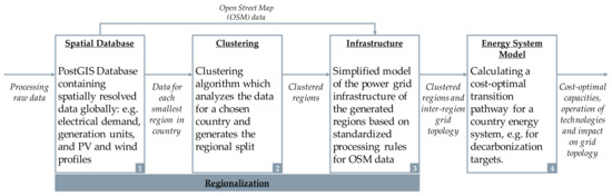 The results of South Africa show the applicability of the developed framework: First, a global database including spatial data for the most important categories of an energy system model is presented. Second, the clustering of the smallest administrative areas in South Africa leads to explainable regions that differ in their demand, generation, and renewable potential characteristics. A benchmarking analysis shows that the developed methodology summarizes the regions better than the classification in states. Third, OSM data can be used to synthesize a simplified electrical grid topology to model the exchange between these regions. The modeling results confirm the classification in clusters by differentiating between regions which are currently important for the system and regions which gain relevance in a future energy system. The grid patterns, resulting from these model results, confirm the hypothesis that the grid topology can change fundamentally.