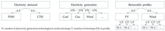 Using the thereby generated set of smallest regions, the data are aggregated for each category. However, regions of bigger size tend to accumulate more data. Therefore, the demand and generation data are normalized by the area of the respective region. Furthermore, all categories are normalized in their respective category since they have different physical units [27]. This normalization ensures the possibility to consider different types of data in the clustering. Especially the renewable profiles of wind and photovoltaics require a weighted normalization since the hourly data set contains much more entries as, e.g., the generation capacities of power plants. Figure 2 visualizes the hierarchy of the weighting process.