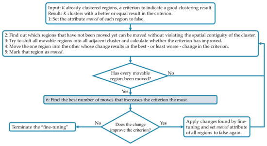 Since the original processing only shifts one single region at once, it is not able to shift any region that connects two other regions in the same cluster. To extend the range of considered regions for a shift, the methodology in [32] is further enhanced by checking if regions exist that are only connected to one other region in the cluster. Similar to the original fine-tuning algorithm, these regions are assessed if shifting them together with other spatially contiguous regions into another cluster improves the overall performance. This second algorithm is applied after each cycle of the original fine-tuning. Figure 3 provides an overview of the overall post-processing algorithm including the further developed improvement after the sixth post-processing step. In contrast to Ward’s method for the hierarchical clustering, the fine-tuning uses a different distance metric by not only calculating the Euclidean distance: as a first step, the Manhattan distance is calculated for each data category A, their sub-categories a, each cluster c, and each member of the cluster x by
