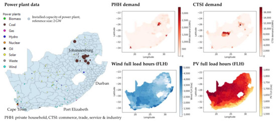 The power plant data indicates a concentration of large coal power plants in the North-East of the country close to the city of Johannesburg. Analyzing the distribution of renewable generation technologies, photovoltaic generation is mostly distributed in the center of the country while wind generation units are built close to the coastline in the West and South. These fit the analysis of the renewable profiles indicated by the respective full load hours: the highest full load hours of wind are along the coastline and for PV the full load hours decrease from North to South. Lastly, the demand data indicates the distribution of settlements in cities or industrial areas. The household demand is high in the agglomeration of Johannesburg, around Cape Town and in a few cities along the coastline, such as Durban or Port Elizabeth. The distribution of the CTSI demand is very similar except for some rural areas showing a high demand which arises, e.g., from mining activities.