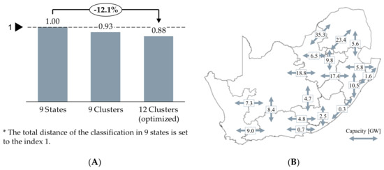 As a last step of the regionalization, the twelve described regions are considered to synthesize the net transfer capacities of the electrical grid by evaluating OSM data. The resulting capacities, depicted in Figure 6B, are validated in two ways: firstly, regions which have high installed capacities of the dominating generation technology coal power plants show high transmission capacities towards load centers at the coastlines. Examples for such regions are Cluster 2, 3, 4, and 11. Secondly, the data quality can be verified by comparing the constructed grid using OSM data to the real grid structure in South Africa [45]. In general, most lines are included and the capacities represent the overall grid structure which is characterized by a strong connection from North-East to South-West and several outflows to cities along the coast. The comparison only identifies few outliers of missing lines or wrong voltage levels. Summarizing the results, the clusters, calculated by the developed regionalization algorithm, represent a suitable regionalization to analyze a regionalized decarbonization pathway of South Africa by including the synthesized grid from OSM data.