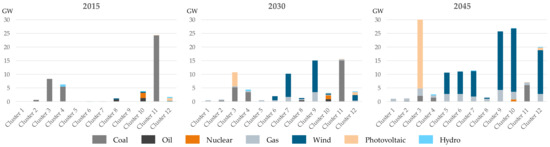 The results for modeling 2015 represent the basic setup of the South African energy system and are similar to the real generation in 2015. Coal is by far the dominating technology and nuclear is the only other technology with a considerable share in the country’s electricity production [46]. The regional distribution in 2015, as shown in Figure 7, matches the characteristics of the clustered regions described in Figure 5: Clusters 3, 4, and 11 are the dominant regions with coal power plants and the only other region with considerable capacities is Cluster 10 where nuclear and oil power plants are located to generate electricity for Cape Town.