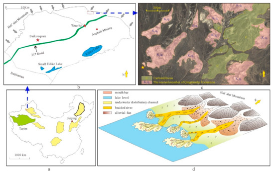 The study area is located in the northwest border of the Junggar basin, the north of Wuerhe, Karamay city, Xinjiang provinces, China. The Qingshuihe Formations (lower Cretaceous), Carboniferous, and Quaternary were exposed in the study area (Figure 1a–c). The formation of the Junggar basin occurred during the Hercynian orogeny, its development being especially active in the late epoch of the Permian period (an epoch in the Hercynian orogeny). The Indosinian movement (257–205 Ma) in the late Triassic period formed the current tectonic pattern of the region. The Junggar basin in the Cretaceous was a gentle monoclinal structure inclined to the southeast and overlaid the Carboniferous strata to the north [46,47,48]. The Cretaceous strata, which are widely exposed in the study areas, can be divided four periods concerning sedimentary deposition: bottom conglomerate sedimentary period, river sedimentary period, shallow lake sedimentary period, and river and delta sedimentary period [46,47,48]. The object of this study is the second member of the lower Cretaceous Qingshuihe Formation (K1q2) (Figure 2), which is mainly composed of sandstone and conglomerate, interpreted to represent the deposits of a braided fluvial to deltaic system (Figure 1d).
