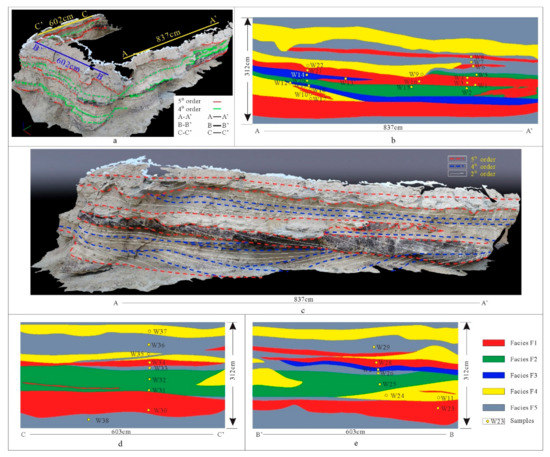 Digital outcrops and architectural element analysis results. (a) The digital outcrops established by the unmanned aerial vehicle (UAV); (b,d,e) the digital sections; (c) the result of architectural element analysis. The yellow dots in (b,d,e) are the samples. Red, green, blue, yellow, and gray in (b,d,e) are facies F1, F2, F3, F4, and F5, respectively.
