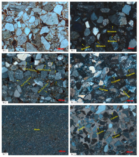 Microscopic characteristics of the facies (W1 includes bitumen; W2 include soft particles; W13 includes gypsum cement; W7 is mudstone; W22 includes calcite cement.).