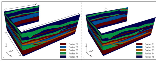 The utilization of conditioning data after relocation are shown in Figure 7b,d. The conditioning data were fully used, and the noise in the simulation results was suppressed efficiently (Figure 8a,b). The results shown in Figure 8a,b reveal that the larger-scale lithofacies anisotropic structures on the z-coordinate and y-coordinate, and the connectivity of facies F1, which is the oil-bearing layer at the bottom of the model were well reconstructed. The lithofacies continuity at the connection between sections A-A’ and C-C’ was also well reconstructed. However, it was difficult to understand whether the conditioning data translated were consistent with the actual geological conditions. The authors reviewed Tran’s (1994) [50] definition of multiple grids. When the grid is coarsened, the conditioning data is often hard to locate. Thus, the conditioning data on the coarse grid should be moved to the nearest coarse grid. This method can effectively improve the simulation results when the conditioning data are relatively discrete and evenly distributed. The conditioning data in section (2) was not discrete or evenly distributed; thus, manual relocation of the conditioning data was required.