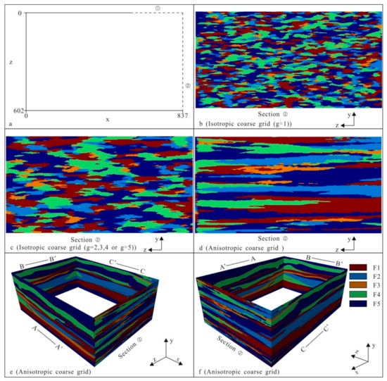 - When using the bidirectional sections (x and z directions) as the training image, the output results exhibited a significant improvement in the reconstruction of lithofacies heterogeneous structures. Figure 10e,f shows the simulation results using a bidirectional training image, and its simulated sequence has been described above. This simulation sequence significantly improves the heterogeneous structure of the lithofacies in a direction parallel to the z direction when compared to those shown in Figure 10c,d, using a unidirectional training image. However, the phenomenon of lithofacies discontinuity still appears in the middle of the coarse grid in the z direction. In addition, lithofacies continuity and lithofacies anisotropic structure in the z direction were reconstructed poorly (Figure 10e,f). Noise in the simulation results persisted after the latter were improved, especially in the z direction. Although this simulation sequence uses bidirectional training images, the pattern of lithofacies in the x direction was just reconstructed in the section of the coarse grids. The pattern of lithofacies of fine grids between coarse grids in the z direction could not be reconstructed.