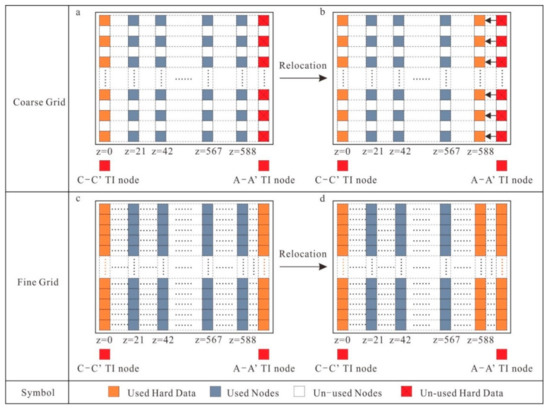 The analysis in the previous sections has proved that larger-scale lithofacies anisotropic structures can be reconstructed using 2nd grade anisotropic multiple grids. However, the utilization of hard data is still insufficient. Figure 7a,c shows the utilization of conditioning data when using 2nd anisotropic multiple grids. After the z-coordinate is roughened with the expansion factor of 21, the coarse grid is closest to the conditioning data on the line where z = 602 is z = 588. The distance between the conditioning data and the coarse grid is 15, and the data events with conditioning data on the sides of the section have a low repetition rate. Therefore, the conditioning data on the intersection between section A-A’ and section (2) was discarded in the coarse grid simulation. This set of conditioning data is used only in the fine grid simulation. The conditioning data on the intersection between section A-A’ and section (2) did not play a controlling role in the reconstruction of the larger-scale lithofacies anisotropic structures. Moreover, this resulted in the lithofacies in Figure 6e being discontinuous. In order to solve this discontinuity in the simulation process, the conditioning data on the z = 602 was translated to z = 588 (Figure 7b), to improve the control effect of this set of conditioning data on the simulation results.