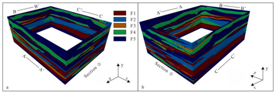 The outcrop (Figure 3a) was studied according to the field methodology proposed by Miall (1988) [41], and this information was used as the basis for classification. Figure 3a shows the digital outcrops and tracking interface of facies, Figure 3b–e is the section interpretation results corresponding to A-A’, B-B’, and C-C’ in Figure 3a. The lengths of the three corresponding sections are 837, 603, and 603 cm, respectively. The height is 312 cm. Facies F2 and F1 include the 4th order bounding surfaces corresponding to the macroform growth increment. Therefore, lithofacies of F1, F2, F3, F4, and F5 are the separated 5th order bounding surfaces corresponding to the channel. According to the results of reservoir architectural analysis, distribution of the five lithofacies in the three sections is described. In order to model the anisotropic structures of reservoir lithofacies through multipoint geostatistics, the surfaces which bounding the five lithofacies in the UAV digital model were vertically projected onto the corresponding plane. Sections A–A’ and C–C’ are defined as sections in the x direction, and section B–B’ is defined as a section in the z direction. The surfaces of UAV digital model of x and z direction were constructed, and these three surfaces were the basic data for multipoint geostatistics simulation (Figure 5a).