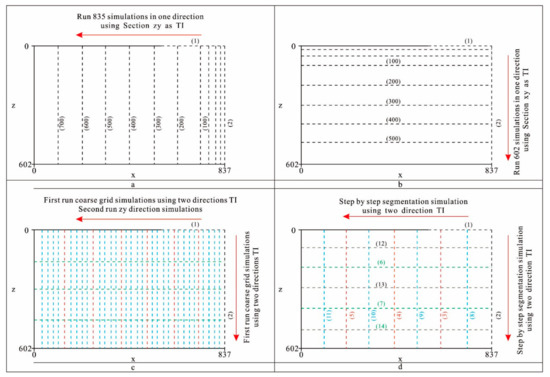 The actual data reveal that the length of the x-coordinate is approximately 1.4 times that of z-coordinate. To study the influences of simulation surface sequence on the results, this section compared the results of using a unidirectional training image and bidirectional training image with different simulation surface sequences. This paper designs four simulation surfaces sequences, which is shown in Figure 9. Figure 9a illustrates the two-dimensional simulations were 835 times in the z direction with the z directional training images only. The simulated results are shown in Figure 10c,d. Figure 9b shows two-dimensional simulations were executed 601 times in the x-y direction with the x-y directional training images only. These results are shown in Figure 10a,b. Figure 9c shows that, firstly, two-dimensional simulations were executed 39 times on the coarse grids in the z direction with the z directional training images; secondly, two-dimensional simulations were executed 28 times on the coarse grids in the x-y direction with the x directional training images; and thirdly, two-dimensional simulations were executed 796 times on the fine grids in the z direction with the z directional training images. The simulated results are shown in Figure 10e,f. The sequence of simulation surfaces as shown in Figure 9d was proposed in this study. Regardless of the relationship between the number of grids in the x-coordinate and z-coordinate, the simulated three-dimension space can be divided into several secondary spaces by several surfaces in the z direction and x direction. Then, the secondary spaces can be divided into four equal thirds by several surfaces in the z direction and x direction, and the thirds can be divided into four equal fourth spaces by several surfaces in the z direction and x direction, and so on. The sequence of simulation surface is also the sequence of construction the secondary space. To generate the conditional data for the next simulation, which are located in the coarse grids, the label of the surface which was used to construct the secondary space showed a multiple of the maximum expansion factor. The advantage of this method is that the conditioning data in the next simulation will not be offset, and the phenomenon of lithofacies discontinuity shown in Figure 6a can be avoided. For example, the number of grids in the x-coordinate was 837, and the number of grids in the z-coordinate was 603, and the maximum expansion factor in the z-coordinate or x-coordinate was 21; thus the three-dimensional space can be divided in to nine secondary spaces by five surfaces (the five surfaces are as follows: surface on which x = 210; surface on which x = 420; surface on which x = 630; surface on which z = 210; surface on which z = 420). Moreover, every secondary space can be divided into four equal third spaces by two surfaces. Consequently, the smallest space was 1 grid (x-coordinate) × 1 grid (y-coordinate). The sequence was named, “cross mesh, refinement step by step.” The simulated results with this sequence are shown in Figure 10e,f.