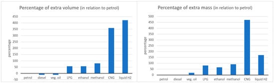 Percent increase of volume and mass of fuel tanks in relation to petrol (55 L tank), [25].