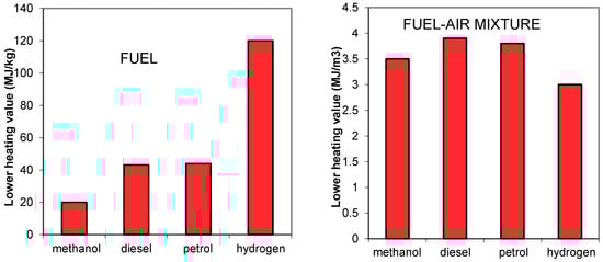 Another important property is the heating value of a stoichiometric air-fuel mixture in terms of volume at atmospheric pressure. This shows the amount of energy that can be introduced into an IC Engine per cycle, which affects torque and power [25]. The importance of this parameter can be illustrated with Hydrogen: although it has the highest HV in terms of mass, its value in terms of volume (of its mixture with air) is one of the lowest (Table 3; Figure 3). Naturally, this parameter affects storage space, which is also critical for mobile applications.
