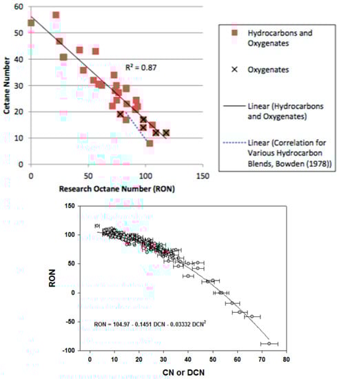 The RON (Research Octane Number) and CN (Cetane Number) used to classify commercial petrol and diesel fuels, respectively, are related to the way the fuel self-ignites. High RON numbers are good for Spark Ignition (SI) engines, whereas high CN numbers are good for diesel engines. In fact, these two numbers are opposed [39,40] (Figure 4).