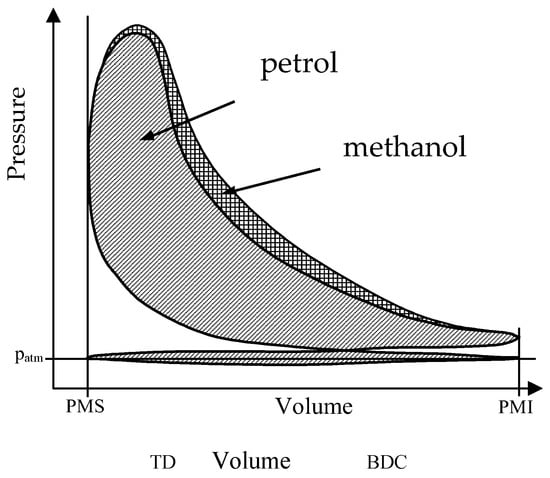 Thus, for the same volume of reactants (2.5) only two volumes are produced when petrol is used, but three are produced when methanol is used. This means there is a substantial higher volumetric expansion when alcohol is used. This can be seen on the indicated diagram, where the methanol shows higher pressure during expansion (Figure 5). This is considering that both petrol and methanol are entirely vaporized when entering the engine, although it is much more difficult to vaporize methanol than petrol, as the latent heat of vaporization of the former (1100 kJ/kg) is much higher than that of the latter (350 kJ/kg), so the relation is even higher.