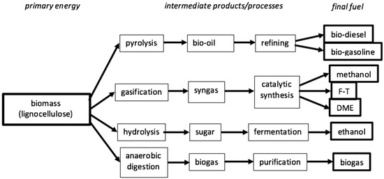 However, as it will be seen later, sometimes it is difficult to assess whether the fuel is “bio” (from renewable energy) or not. For example, biodiesel is seen as a biofuel, but the 10% of methanol required for the transesterification process is usually produced from natural gas, a fossil fuel (Figure 2). Some fuels (such as hydrogen or ammonia) can be produced from fossil sources (hydrogen from natural gas or oil) but they can also be produced entirely from renewable sources. This is the case for the hydrogen produced from hydrolysis of water using renewable electricity such as solar or wind, as well as photochemical cells. Other so-called solar fuels can also incorporate CO2 using the same methods [29]. Also, biomass can be converted to other more convenient fuel forms through the incorporation of solar energy, which aids the pyrolysis process [30].