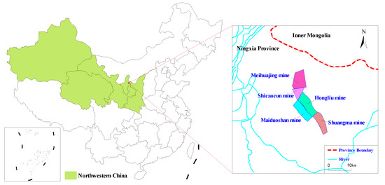 Five mining areas are contained in the study area and distributed in a north–south strip, including Meihuajing, Shicaocun, Hongliu, Maiduoshan, and Shuangma mining areas. It extends about 44 km from north to south and 5.5–11.8 km from east to west, with a total area of about 370.67 km2. The study area is located in the east of Ningxia and the west of Ordos Basin. It belongs to a typical semi-desert and semi-arid continental climate. The surface of the study area is mostly the semi-desert and the low hilly area, most of which are covered with vertical and horizontal sand dunes. The geographical location is shown in Figure 1.