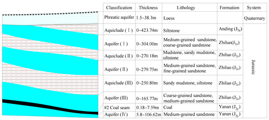 The geological data obtained from a total of 629 drilling holes were analyzed. The main coal seam in the study area is #2 coal seam with an average buried depth of 548 m, on which there are multi-layer Zhiluo formation aquifers. According to the geological data obtained from drilling, the lithology and combination structure characteristics, aquifer burial conditions, hydraulic properties, and other factors are considered, and the strata above the #2 coal seam can be classified into aquifer and aquiclude (Figure 2). Aquifer III in the lower part of Zhiluo formation is mostly the direct roof of #2 coal seam in the study area, and is mainly composed of coarse-grained sandstone, followed by medium-grained sandstone. The stratigraphic development of Aquifer III is relatively stable with a thickness of 0–165.77 m. Aquifer II in the middle part of Zhiluo formation is mainly composed of medium-grained sandstone and fine-grained sandstone. The stratigraphy varies greatly, with a thickness of 0–279.75 m. Aquifer I in the upper part of Zhiluo formation in the study area is mainly composed of weathered medium-grained sandstone and coarse-grained sandstone with the argillaceous cementation. The buried depth of the top boundary is 31.35–108.55 m, with an average buried depth of 68.31 m. It is a shallow buried area, and the buried depth of the groundwater level is 1.97 m. Besides, a unified aquifer is formed by partial Aquifer I in the upper part of Zhiluo formation and the aquifer of Anding formation or the Quaternary sedimentary aquifer. Aquiclude III of Zhiluo formation is mostly composed of silty mudstone, sandy mudstone, and siltstone, with a thickness of 0–250.8 m. Aquiclude II of Zhiluo formation is mainly composed of mudstone, silty mudstone, and siltstone, with a thickness of 0–270.18 m. Aquiclude I of Anding formation is far away from #2 coal seam, which has little influence on the coal seam mining. Therefore, Aquiclude I is not discussed in this study. In the south of Hongliu and the north of Shuangma mining areas, the Zhiluo formation is denuded owing to the influence of fault uplift. The thickness distribution characteristics of each aquifer and aquiclude in Zhiluo formation are shown in Figure 3.