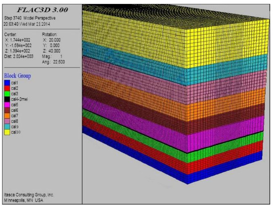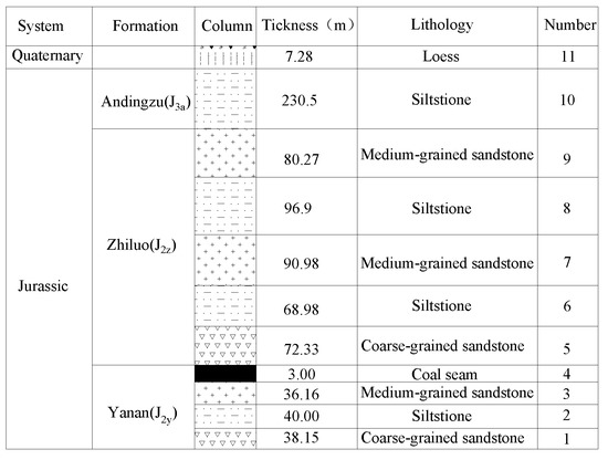 The sedimentary relationship of Hongliu mine is shown in Figure 5. According to the actual geological conditions of the strata, the length, width, and height (i.e., Y, X, and Z directions) of the model are 1000 m, 300 m, and 446.50 m, respectively. The numerical simulation software FLAC3D (5.00, Itasca Consulting Group, Inc., Minneapolis, Minnesota, USA) was used. The established numerical model is shown in Figure 6. The rock core obtained was tested, and the mechanical parameters of each stratum were obtained, as shown in Table 1.