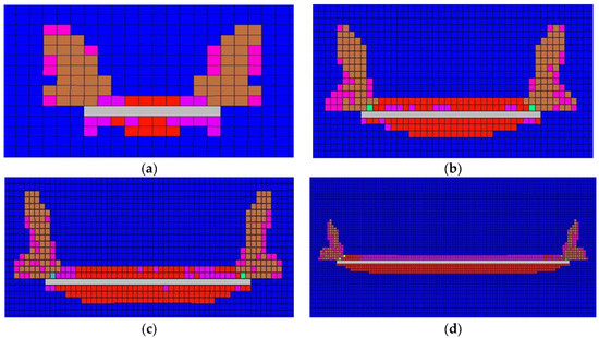 Development process of fracture zone in the roof and floor of coal seam during mining. (a) Mining distance of 50 m; (b) mining distance of 150 m; (c) mining distance of 200 m; (d) mining distance of 500 m.