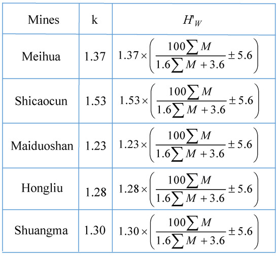 Through the numerical simulation analysis, the development height of the water-conducting fracture zone of each mining area is determined: 72.2 m of Meihuajing, 83 m of Shicaocun, 73 m of Hongliu, 66 m of Maidongshan, and 67.6 m of Shuangma. According to the empirical formula, the maximum fracture height of each mine is 52.8 m in Meihuajing, 54.5 m in Shicaocun, 57.3 m in Hongliu, 53.7 m in Maidongshan, and 51.8 m in Shuangma. The results of numerical simulation are compared with that of empirical formula, and a ratio coefficient k is obtained. The empirical formula is modified by proportion, and the development height H’W of the water-conducting fracture zone after the modification of each mine is obtained (Figure 8).