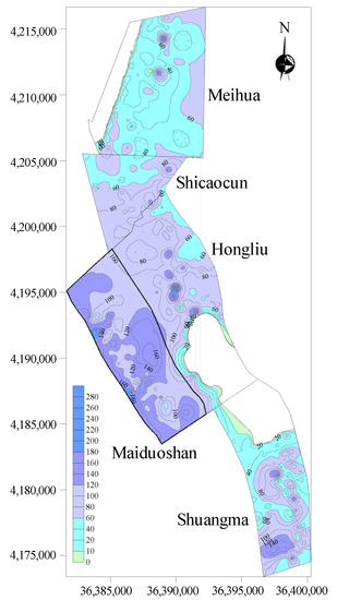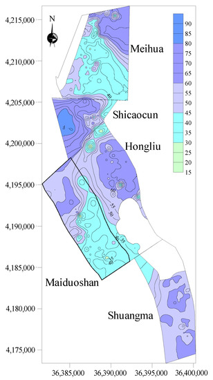 The thickness of the reservoir rock layer is the key factor to determine the water-abundance strength of aquifer and the storage state of groundwater [24]. When the coefficient of hydraulic conductivity is used to evaluate the water abundance, the variation of the hydraulic conductivity is controlled by the thickness of the water-bearing rock layer if the influence of the hydraulic conductivity is ignored. The aquifer of the water-conducting fracture zone is the direct water-inrush aquifer of the coal seam, so the thickness of the aquifer within the development height of the water-conducting fracture zone is taken as the standard to evaluate the water abundance of rock strata. According to the geological data, the contour map of the total thickness of sandstone within the fracture zone is made (Figure 10). It is worth noting that, when the water-conducting fracture zone passes through the aquifer floor, the aquifer within the whole influence range of fracture is considered to be the direct source of mine water. Therefore, the total thickness of the aquifer within this range should be counted.
