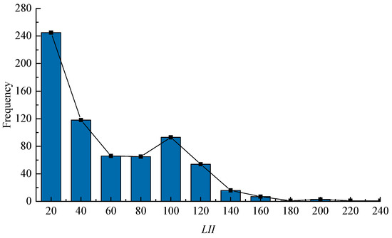 According to statistical data, the corresponding data in each borehole of each mine are substituted into Equation (2), and LII of each borehole in the mine is calculated. As shown in Figure 11, the statistical results of LII values are expressed in a histogram, and the partition thresholds of 10, 40, and 100 are obtained. LII 0–10 is defined as the region with weak water abundance, LII 10–40 is the region with medium water abundance, LII 40–100 is the region with strong water abundance, and LII 100–240 is the region with extremely strong water abundance. Figure 12 shows the LII contour map.