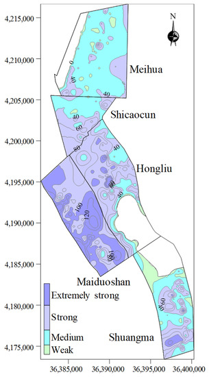 It can be seen from Figure 12 that the south of Maiduoshan, Hongliu, Shicaocun, the southeast and southwest of Meihuajing, and the middle and south of Shuangma are areas with the extremely strong and strong water abundance; the north of Shicaocun, the north of Shuangma, and most of Meihuajing are areas with medium water abundance areas; while the south of Meihuajing, the south of Hongliu, and the north of Shuangma are areas with the weak water abundance. In the areas with strong water abundance, the risk of water inrush is also high. In the areas with weak and medium water abundance, the influence of coal mining on aquifer is weak. The method of drainage borehole can be used to ensure the safety of production. In areas with extremely strong and strong water abundance, the mining method should be changed. For example, the development height of water-conducting fracture zone can be reduced by limited-thickness mining and backfilling to realize water conservation mining and safety coal mining [25,26]. Considering the area ratios of the water abundance classes in one mine, the water abundance of one mine can be determined by water abundance classes that cover the most area of one mine. Thus, Maduoshan mine can be classified as a mine of extremely strong and strong water abundance. Similarly, Hongliu can be classified as a mine of strong water abundance, Shicaocun and Shuangma as mines of strong and medium water abundance, and Meihua as a mine of medium water abundance.