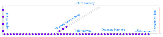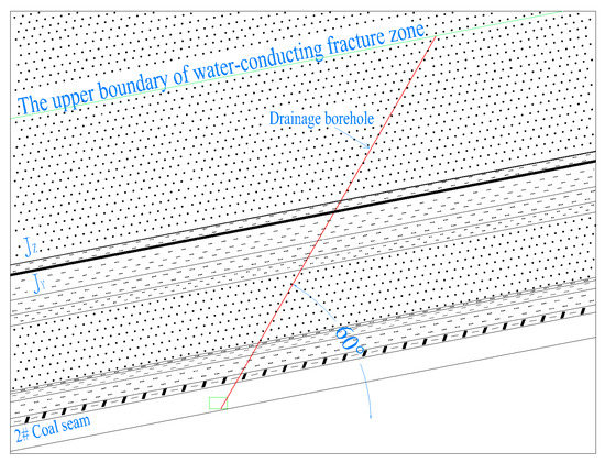 Working face 112208 is located in the south end of Meihuajing coal mine, with the medium water abundance. The main source of groundwater recharge is atmospheric precipitation, followed by the overflow recharge between aquifers. It is estimated that the water inflow of the working face is small, so the method of roof drainage borehole is selected to control the water inflow of working face 112208. Before advancing the working face, 54 drainage holes were arranged, which were mainly located in the belt roadway, open-off cut, and measurement roadway (Figure 13). The elevation angle of the borehole was 60° and the depth of the borehole was the development height of the water-conducting fracture zone. If the depth of the borehole did not reach the development height of the fracture zone owing to the actual situation on site, it must be ensured that the vertical depth of the borehole in the aquifer III was no less than 10 m (Figure 14).