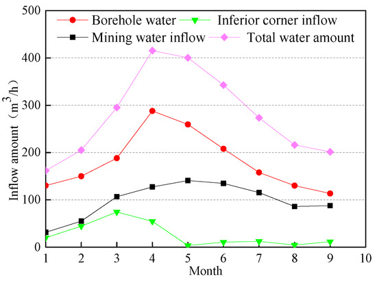 The total inrush water of a working face is composed of pre-drainage borehole water, mining inrush water, and inferior corner water. According to the water inflow composition of working face 112208, pre-drainage borehole water accounts for a high proportion. Although the total inrush water of the working face increases with the expansion of the roof mining fracture and caving zones, the fluctuation trend of the total inrush water in the working face is still mainly affected by the drainage borehole water. For example, according to the analysis of the changing trend of the monthly average inrush water in the mining process of the working face, the total inrush water of the working face rises and falls synchronously with the pre-drainage borehole water (Figure 15).