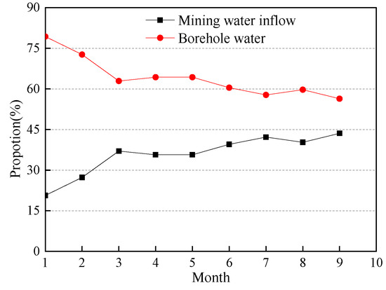 According to the source of water inrush in the working face, the pre-drainage borehole water also accounts for a high proportion. As shown in Figure 16, the proportion of the pre-drainage borehole water in the total inrush water of the working face generally decreases during the survey period, while the minimum is still 56.4%. The proportion is up to 80.5% and 73.1% in the two months of the initial mining stage (January and February 2016), indicating that the pre-drainage borehole measures greatly reduce the natural water inflow in the mining process and effectively control the post-mining water disaster.