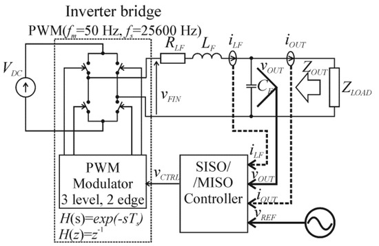 A much more sophisticated system is a multi-input single output (MISO) system (Figure 1), in which the output current, the output filter inductor current, and the output voltage are measured and all of them are used as the input variables of the output voltage controller. In this case, the output current is also treated as a disturbance because the state-space matrix of the VSI does not depend on the particular load. However, in the case of MISO, we measure the output current (treated as a space variable or a measured disturbance [20]), which renders the problem of the missed feedback loop (output voltage—output current) unimportant.
