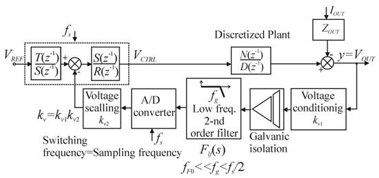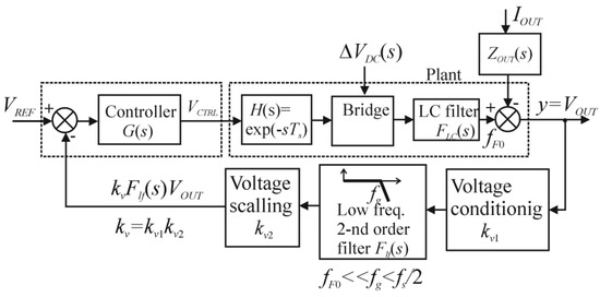 The transfer function of a simple continuous SISO model (Figure 1) of VSI (Figure 2) is calculated in Equation (1). Let us assume that in the steady state VOUT = VREF and kV = 1.