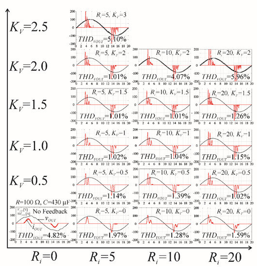 The restrictions of the operating area, shown in Figure 7, can be one of the reasons for the THD increase in the higher values of PBC gains presented in Figure 5 and Figure 6. However, Equation (56) does not consider the modulation index M value because the maximum carrier slope does not depend on M (the reference voltage depends on M). Equation (56) is calculated for RLOAD = ∞, while the restrictions of the Kv value for the existing load resistance will be slightly lower.