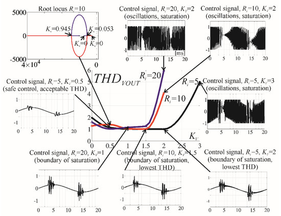 Figure 6 presents two problems. The first is saturation in the PWM modulator due to overly high values of the PBC gains (Ri and KV). The second case can be presented comparing the root loci from Figure 4a,b and Figure 6. For Ri = 10, oscillations can occur for KV = 0–1, for Ri = 20, and for KV = 0.5–1.5. The second problem was not so important. The value of M = 0.3 was too low in practice. It was experimentally checked in the VSI model and finally set at M = 0.8, Ri = 5, and KV = 0.5. The equations from the literature did not solve the problem of restricting the upper Ri and KV values. From Figure 5, it is obvious that an MISO control with a low M value is able to efficiently control the output current. The presented PBC control was further named IPBC2 because compared to the basic PBC theory [34], it used the output voltage as in [34] and its derivative in the final control law. This derivative was absent in the improved PBC (IPBC) that was presented in [34].
