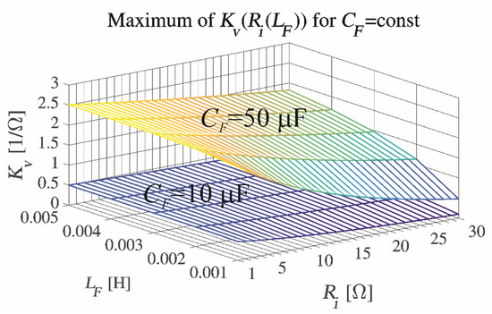 The restrictions (worst case) of the maximum Kv gain due to the Ri gain in the function of LF, for the constant CF to keep the derivative of the control voltage below the maximum carrier slope in the PWM modulator for LF = 1–5 mH, CF = 10 and 50 µF, RLF = 1 Ω and RLOAD = ∞, according to Equation (56).