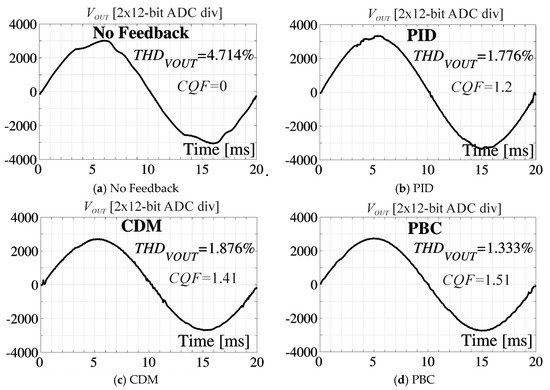 The comparison of the SISO-PID (the version from [8,9]), SISO-CDM, and MISO-PBC-IPBC2 systems was based on measurements of the VSI output voltage for standard loads. Figure 8a–d presents the output voltage for the standard [19] nonlinear rectifier RC load for R = 100 Ω and C = 430 μF. The vertical axis of Figure 8a–d is scaled in units of the 13th bit bipolar Analog To Digital Converter ADC. The actual voltage amplitude was about 60 V. The output filter (LF = 1 mH, CF = 50 μF) resonant frequency was about 712 Hz. The initial analysis (Section 2) showed that the feedback loop is only important for the neighborhood of this frequency (about 14th harmonic) and below. Therefore, a sufficient frequency range for comparing the controllers was from the 2nd up to the 30th harmonic. Figure 8a–d presents the output voltage waveforms without feedback and with the PID, CDM, and PBC-IPBC2 controllers. The THD coefficient was calculated for each case. The PID and CDM controllers had similar THD, while for the PBC, it was a bit lower. However, the output voltage waveforms were different. The harmonics spectra are presented in Figure 9a–d. It can be noticed that the harmonics spectrum is different for the different controllers. Some of the harmonics are increased (e.g., the 2nd harmonic for the CDM controller increased because the voltage waveform was not ideally symmetrical). The importance of a decrease or increase in a specific harmonic was dependent on its relative amplitude. Therefore, the influence of the feedback loop on the particular harmonic can be defined as in Equation (57),