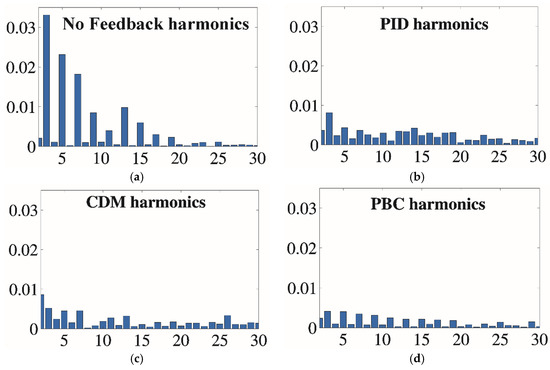 Measured harmonics spectrum of the different types of control systems, (a) without the feedback loop; (b) the SISO-PID controller; (c) the SISO-CDM controller; (d) the MISO-PBC-IPBC2 controller.