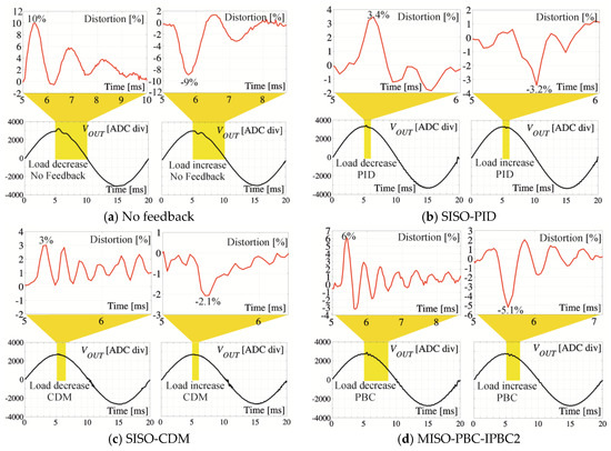 The over- and undershoots after a decrease and increase in the dynamic load (45 Ω to 500 Ω and 500 Ω to 45 Ω) and the settling time, (a) without the feedback loop; (b) the SISO-PID controller; (c) the SISO-CDM controller; (d) the MISO-PBC-IPBC2 controller.