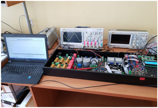 For the experimental model: Ts = 1/fs = 1/2,5600 s, LF = 1 mH, CF = 50 μF, RLF = 1 Ω, RLOAD = 50 Ω; the PID controller transfer function from [8] will be b0 = 18.014, b1 = 33.495, b2 = 16.094. These coefficients were analyzed based on the root locus [8]. In Reference [9], these coefficients were slightly adjusted: b0 = 18.381, b1 = 34.179, b2 = 16.423.