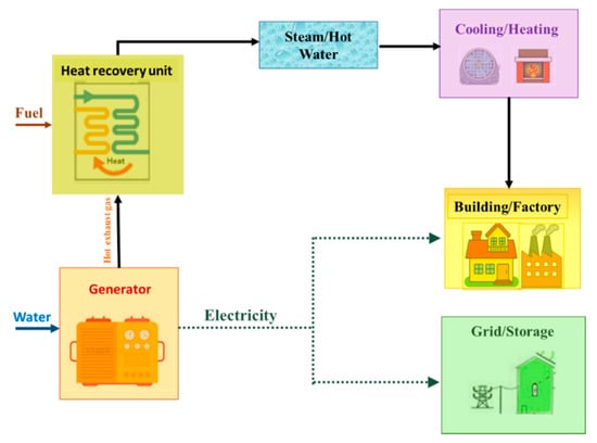 Fuel processor changes the fuel to hydrogen-rich feed streams like natural gas or methanol. The stack then produces electricity, as well as thermal energy, once the hydrogen gas is supplied to it. The power required by the end-user is obtained using the power conditioning system in the form of non-linear DC voltage. Combined heat and power systems are usually made up of a generator, as well as a heat recovery module, as shown in Figure 1, adapted from Reference [29].