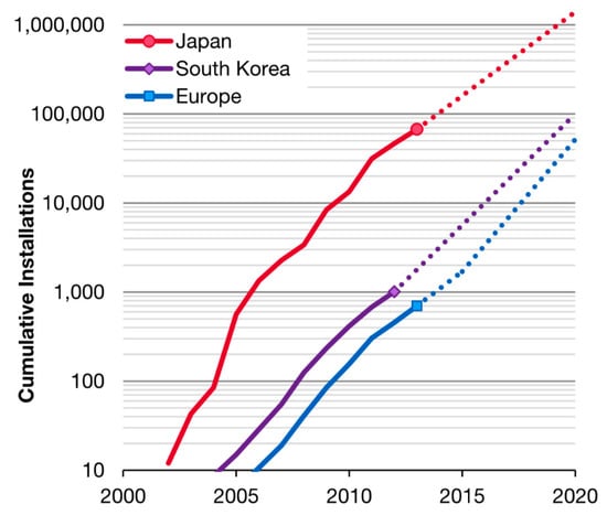 As depicted in Figure 2, the fuel cell combined heat and power systems keep increasing appreciably worldwide, and these values have increased twice-yearly [91]. For instance, the fuel cell commercial shipments increased to 45,700 units as of 2012 [92]. It has been deduced that since 2013, the global market sales for fuel cell combined heat, as well as storage, always exceeded the internal combustion engine system in terms of purchasing capacity. Japan continues to dominate the market share for global fuel cell combined heat and power systems [93]. The Japanese government is nearly meeting its targets in terms of installing 1.4 million fuel cell systems. The basic goal laid down by the South Korean government is to establish a 1 million fuel cell systems, and that of the European Union is 50,000 fuel cells installed.