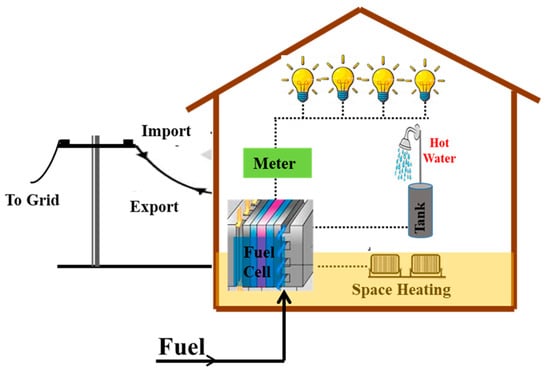 The gas distribution network from Figure 4 supports the transmission of natural gas. The fuel cell, on the other hand, generates heat for space, as well as water heating coupled with electricity for the light and other appliances. The electricity is sometimes exported to the grid when it is produced in excess and imported as well when demand is high. A storage tank for hot water is also used for storing excess heat. It is equally possible for them to be operated in places where there no electric grid or even a network for distributing natural gas. In an instance like that battery storage is needed. During situations like this, battery storage is required, and the fuel will be supplied in cylinders. European Union cogeneration directive explains micro combine heat and power systems as being made up of below 50 kW. Other authors similarly restricted these values to 15 kWe, and this is ideal for single-family houses and small business.