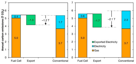 It is anticipated that residential fuel cell combined heat and power systems of about 1 kW will decrease domestic gaseous release into the atmosphere by 1.3–1.9 tons of carbon dioxide yearly in Japan and Germany. Fuel cells combined heat and power producer CFCL reports to save around 3tonnes per year because of its larger capacity on its BlueGen [112]. A fuel cell and micro combined heat and power systems having an electrical output of 1 kW can produce daily savings estimated at 4.5+ kg carbon dioxide in winter, and 3+ kg carbon dioxide in the summer. The total carbon emissions annually subject to the performance of PEMFCs in UK home has been compared to traditional heating systems as captured in Figure 6 [113]. It was, however, deduced that for a country that relies on coal-fired power, the yearly carbon savings from the fuel cell is likely to be higher [114,115,116]. Residential proton exchange membrane fuel cells produce 553 g of carbon dioxide to generate 1 kWh of power and 1.4 kWh of heat [116]. The fuel processor is the source for the emission of carbon dioxide. The fuel processor splits the hydrocarbon fuel to hydrogen gas, carbon dioxide, as well as other impurities, with few amounts of fuel being produced for the generation of heat required for reforming.