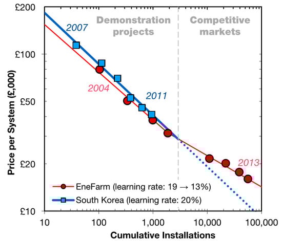 The cost of the residential system has declined massively in the last decade. In Japan, government subsidy forms nearly 50% of the price for installing the unit. The cost of the system can decrease significantly with respect to time, but this is subject to the economies of scale provided due to producing them in larger quantities. Figure 7 summarizes the cost in terms of reduction for proton exchange membrane fuel cells in Japan and South Korea.