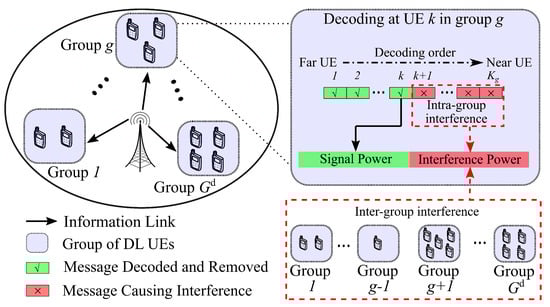 Consider the g-th DL group that consists of DL UEs. As illustrated in Figure 1, the UEs adopt an SIC technique to decode the messages. Particularly, the DL UEs in the g-th DL group can be sorted in descending order of their distances to the BS, i.e., the farthest and nearest DL UEs are denoted by and , respectively. A certain DL UE, , can remove the messages intended to farther DL UEs, , while suffering from the interference caused by the signals of nearer DL UEs. We assume to be the channel vector of the k-th DL UE in the g-th group. The signal intended to is represented by with . Therefore, the post-SIC signal received at can be expressed as
